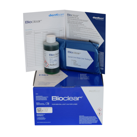 Weekly biofilm remover for dental unit waterlines. Attacks constituent bacteria of biofilm, inhibiting regrowth and ensuring water quality is within guidelines. Ready-to-use, pH neutral. Kit includes Bioclear 200ml x 12, Rinse Test Strips x 50 and Water Testing Kit.