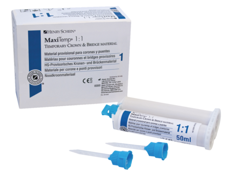 Crown and bridge acrylic in a 1:1 ratio. Self-cured material based on multifunctional methacrylic esters. Excellent marginal adaption. Highly polishable. Temporary restorations can be produced in the mouth or on a model. Working time: 30 secs. Curing time: 4 mins from start of mixing. Removal time from mouth: 1-1.5 mins (including mixing time). Fully trimmable at 4 mins (including mixing time). Intro Kit includes Cartridge 50ml and Mixing Tips x 6.