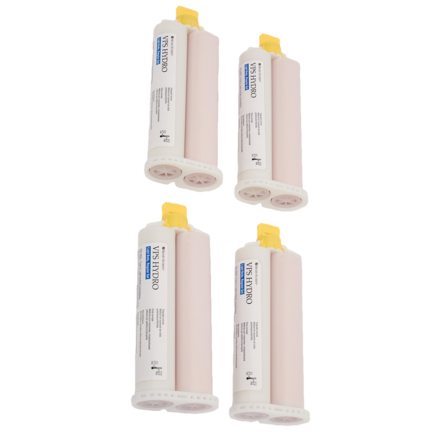 Hydrophilic vinyl polysiloxane wash material in cartridge format. Thixotropic - flows easily under pressure. Superior adhesion between putty and wash. Superb elastic recovery from deformation. High tear resistance. Total working time (incl. mixing time): light body regular 2 min; light body fast 1:30 min; regular body 2 min. Time in mouth (minimum): light body regular 3:30 min; light body fast 2:30 min; regular body 3:30 min. Setting time (includes mixing time): light body regular 5:30 min; light body fast 4 min; regular body 5:30 min.
