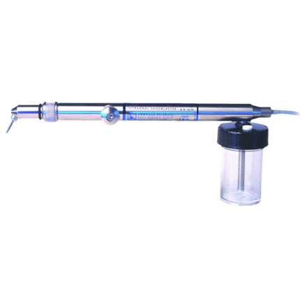 Autoclavable sandblaster. Sand blasting gives a surface that is superior to acid etching or bur abrasion, without using acid in the surgery. Finger controlled and provides a precise abrasive stream. Contra-angle nozzle with 360° swivel action. 12 month warranty (manufacturer defect only).