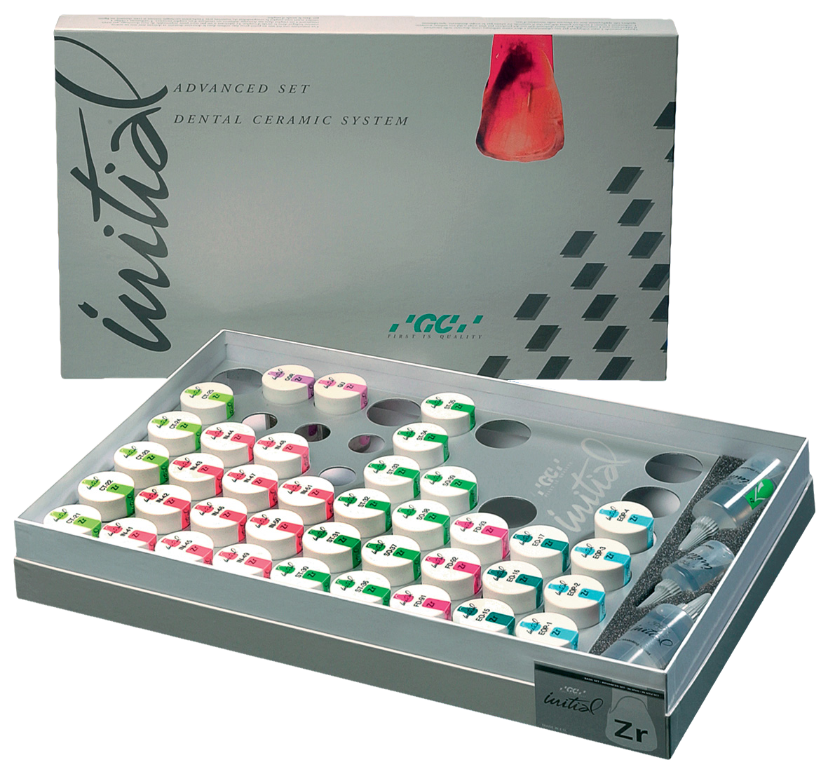 Comprehensive shade and layering system. Exactly cross-matched coefficients of thermal expansion. No long cooling times. Superior aesthetics on high tensile strength zirconium frameworks. Very good wettability. Best adhesion. Natural-looking aesthetics. High biocompatibility. Conventional fixation in the patient's mouth. Advanced Set INside x 11, Cervical Translucent x 5, Enamel Occlusal x 3, Enamel Opal x 4, Shoulder Transpa x 7, Shoulder Opaque x 3, Fluo-Dentin x 3, Gingival Universal, Correction Powder, Glaze Liquid 25ml, Modelling Liquid 50ml, Shoulder Liquid 50ml, Shade Guide