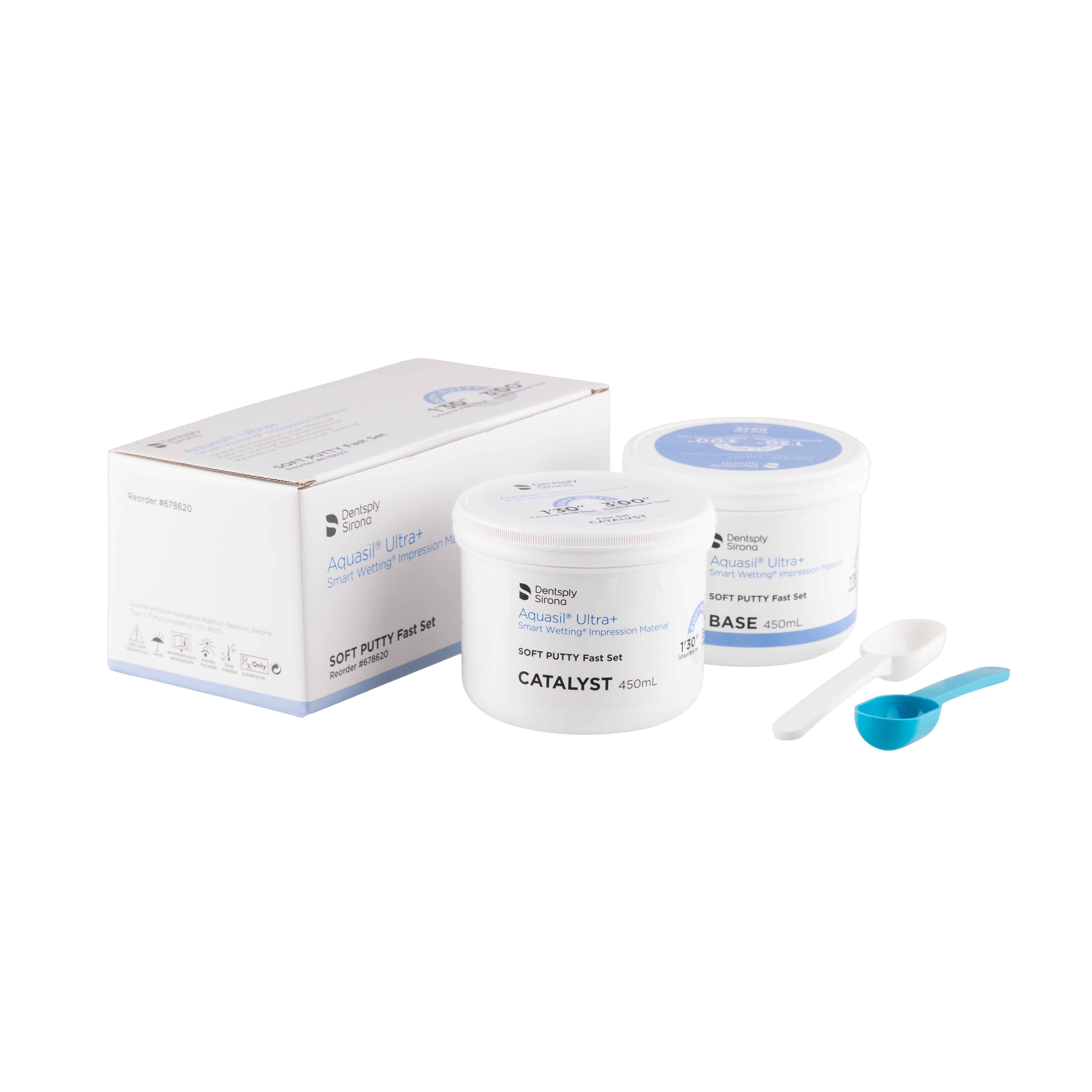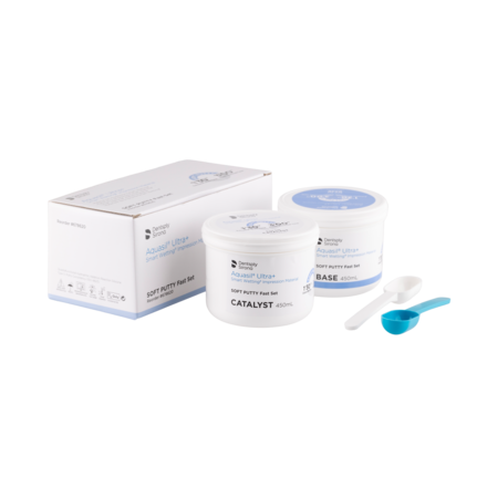 Vinyl polysiloxane (VPS) impression material featuring several options for viscosity and setting time. Can be used for all dental impression techniques. Proprietary quadra-functional modified (QM) resin and Smart Wetting® technologies provide high tear strength, as well as excellent hydrophilicity and detail reproduction. Soft Putty Fast set includes Base Jar 450ml, Catalyst Jar 450ml and Measuring Spoons x 2.