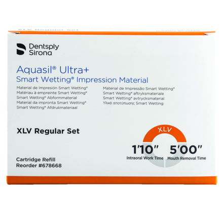 Vinyl polysiloxane (VPS) impression material featuring several options for viscosity and setting time. Can be used for all dental impression techniques. Proprietary quadra-functional modified (QM) resin and Smart Wetting® technologies provide high tear strength, as well as excellent hydrophilicity and detail reproduction. XLV Regular set includes Cartridge 50ml x 4 and Mixing Tips x 12.