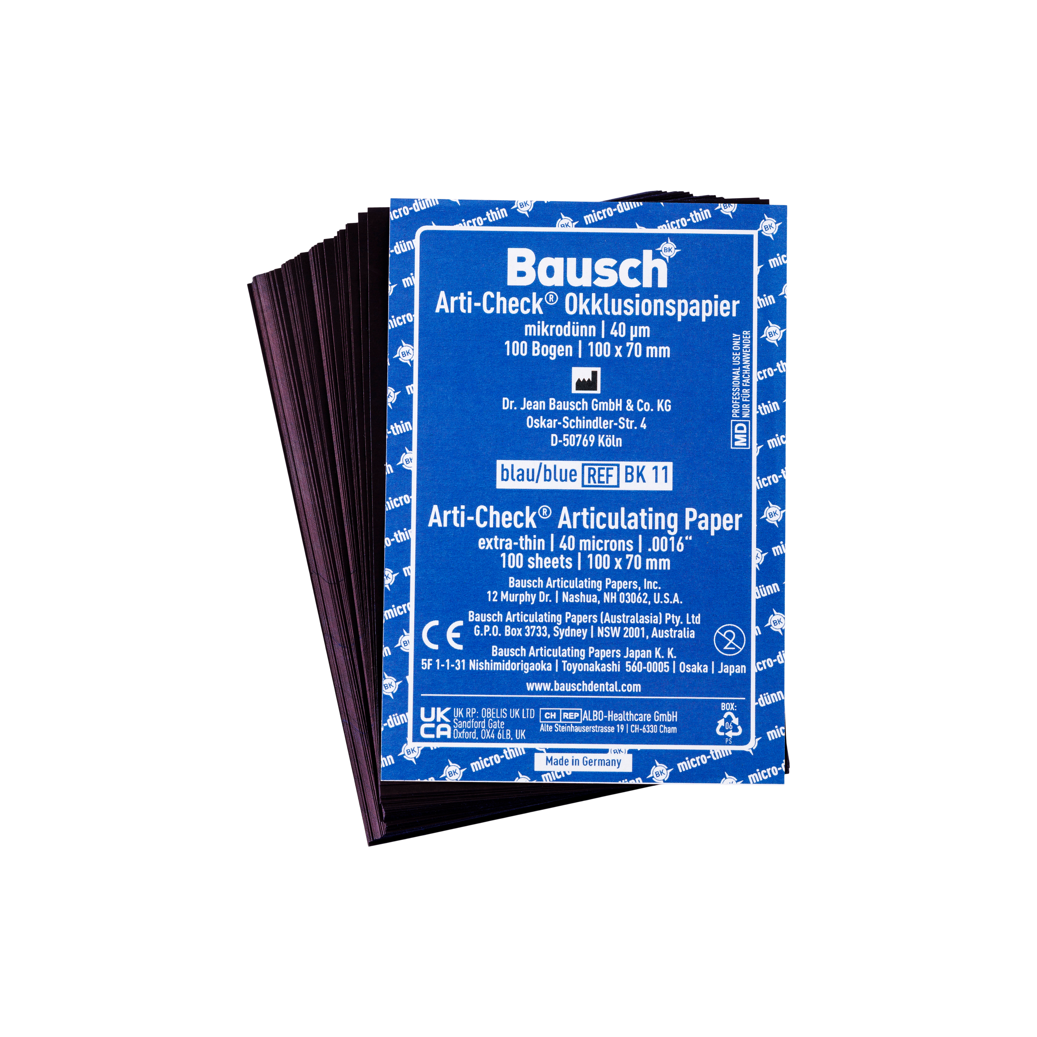 Micron-thin articulating paper. Extremely thin and tear-resistant and are coated with liquid colours on both sides. This special coating with liquid colours facilitates accurate marking of all occlusal contacts or occlusal interfaces. Suitable for the two-tone representation of static and dynamic occlusion. These papers mark precisely because of the thin material.