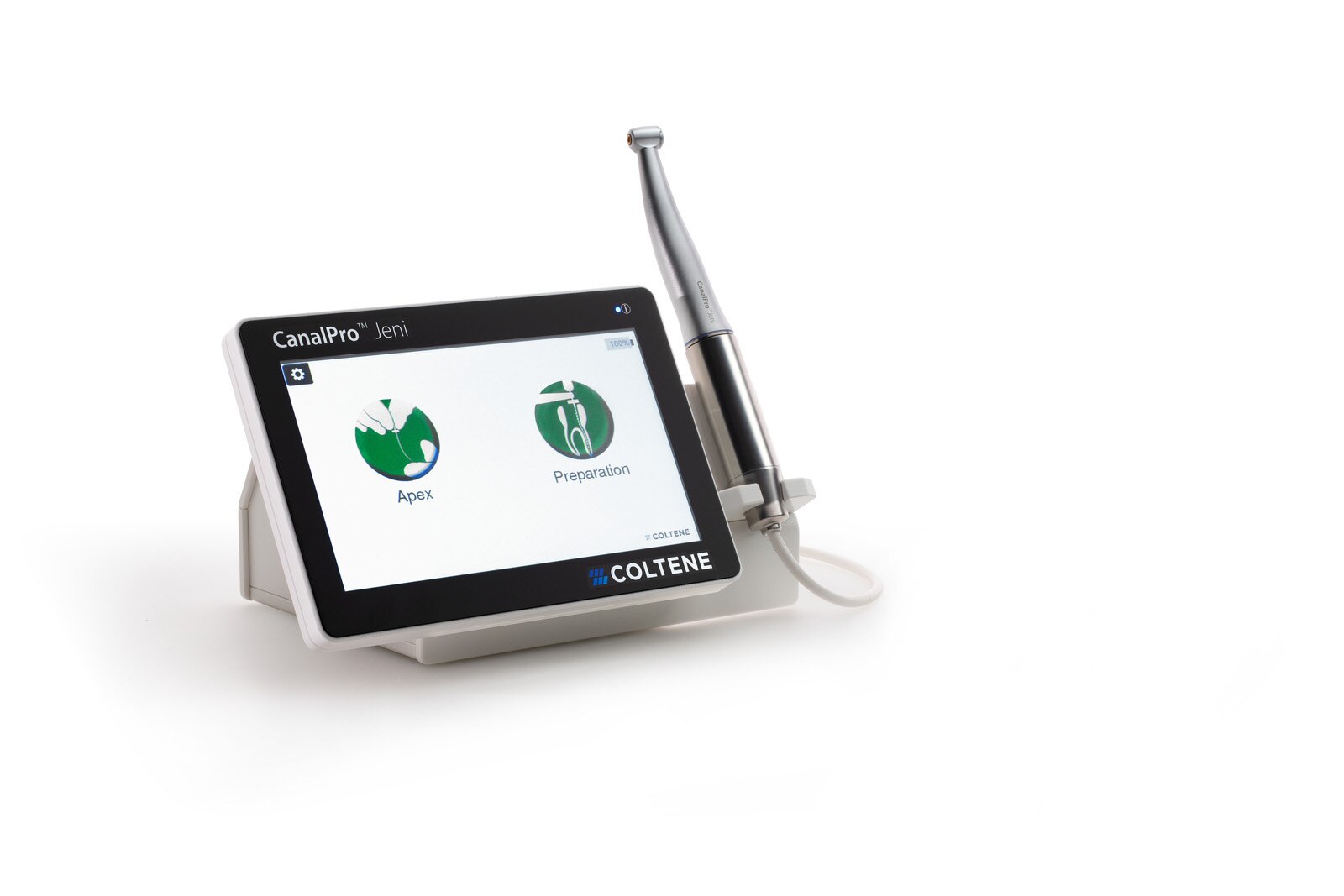 Digital assistance system for working-length determination during root canal preparation. Motor guides the user safely through the root canal and supports the mechanical and chemical preparation steps. Integrated apex locator measures length without interruption. Distinctive software to control the file movement, which can detect the performance of the file and notify when a file change is recommended by releasing a special acoustic signal sound. Automated irrigation recommendation for a successful treatment. Perfectly matched to the HyFlex and MicroMega NiTi file systems, and flexible use due to Doctor's Choice function. Set includes Control Unit, Motor with Apex Measuring Contact, Fully Insulated Angled Handpiece 1:1, Bluetooth Foot Switch, Power Supply, Apex Cable Set, and Holding Bracket for Apex Cable.