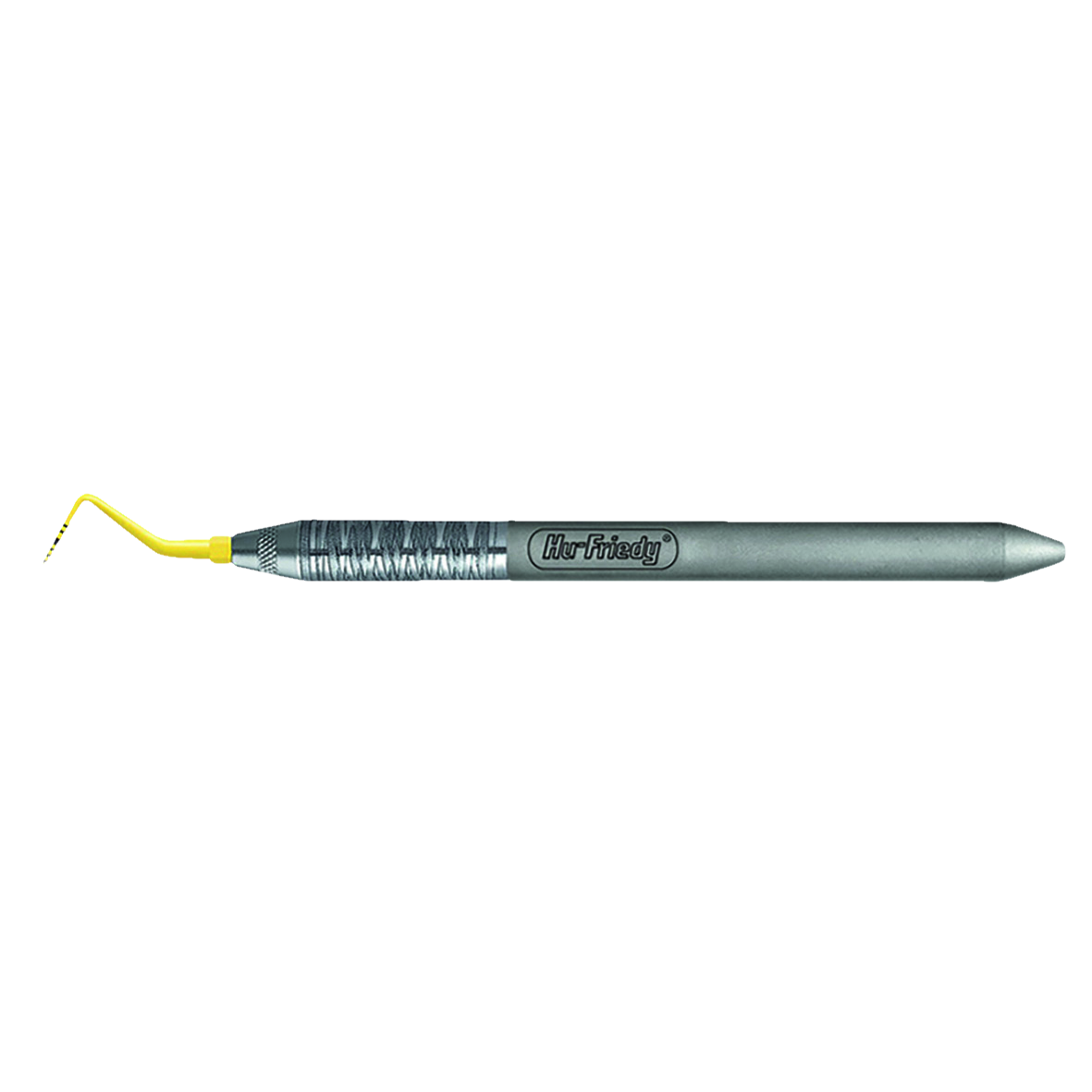 Probe featuring a vivid yellow tip with black markings for enhanced contrast to intraoral structures. Optimal flexibility and a rounded tip provide greater patient comfort and acceptability. Probe tips are safe for use with implants and feature a twist-on design for easy replacement of worn tips.