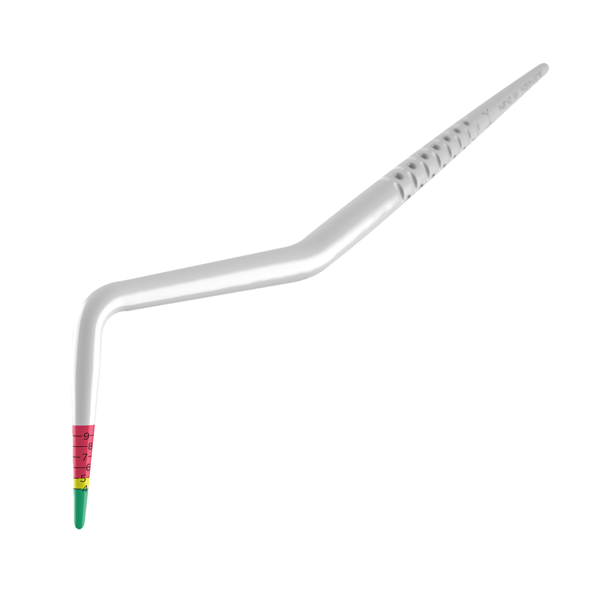 Height indicator designed to guide matrix selection and curing. Numbers are printed on the indicator so the correct Evolve matrix is selected, helping to reduce waste when incorrect matrices are chosen. Coloured tip indicates if a cavity prep can be cured in one layer or if more must be used.