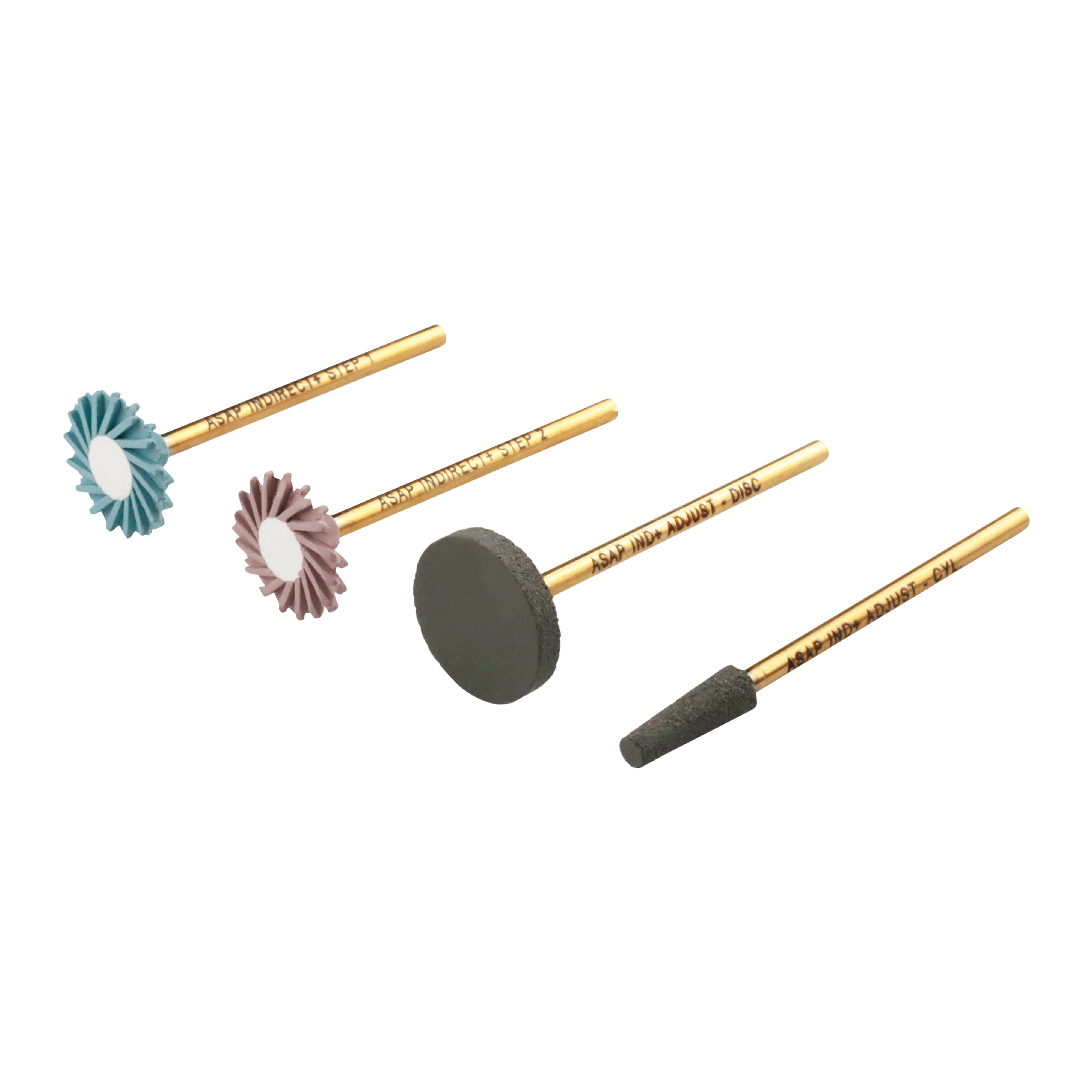 Intraoral kit used to refine and create an outstanding high-gloss shine on all indirect ceramic restorations in under one minute. Versatile system allows the user to refine the restoration after the initial adjustment has been made with a diamond bur, and then polish to a glazed-like appearance. Designed with a higher concentration of diamond particles coupled with a durable silicone binder, ideal for zirconia and ceramics. Multi-shaped diamond-impregnated adjusters (disc, point and cylinder) allow for minor adjustments or to remove scratches caused by diamond bur adjustments. Diamond-impregnated spiral wheel polishers (pre-polisher: blue, final polisher: pink) deliver a fast, super-high-gloss polish. Easily access any surface - occlusal, lingual, interproximal and facial. Includes Coarse Adjuster Disc, Coarse Adjuster Cylinder, Pre-Polisher x 2, and Final Polisher x 2.