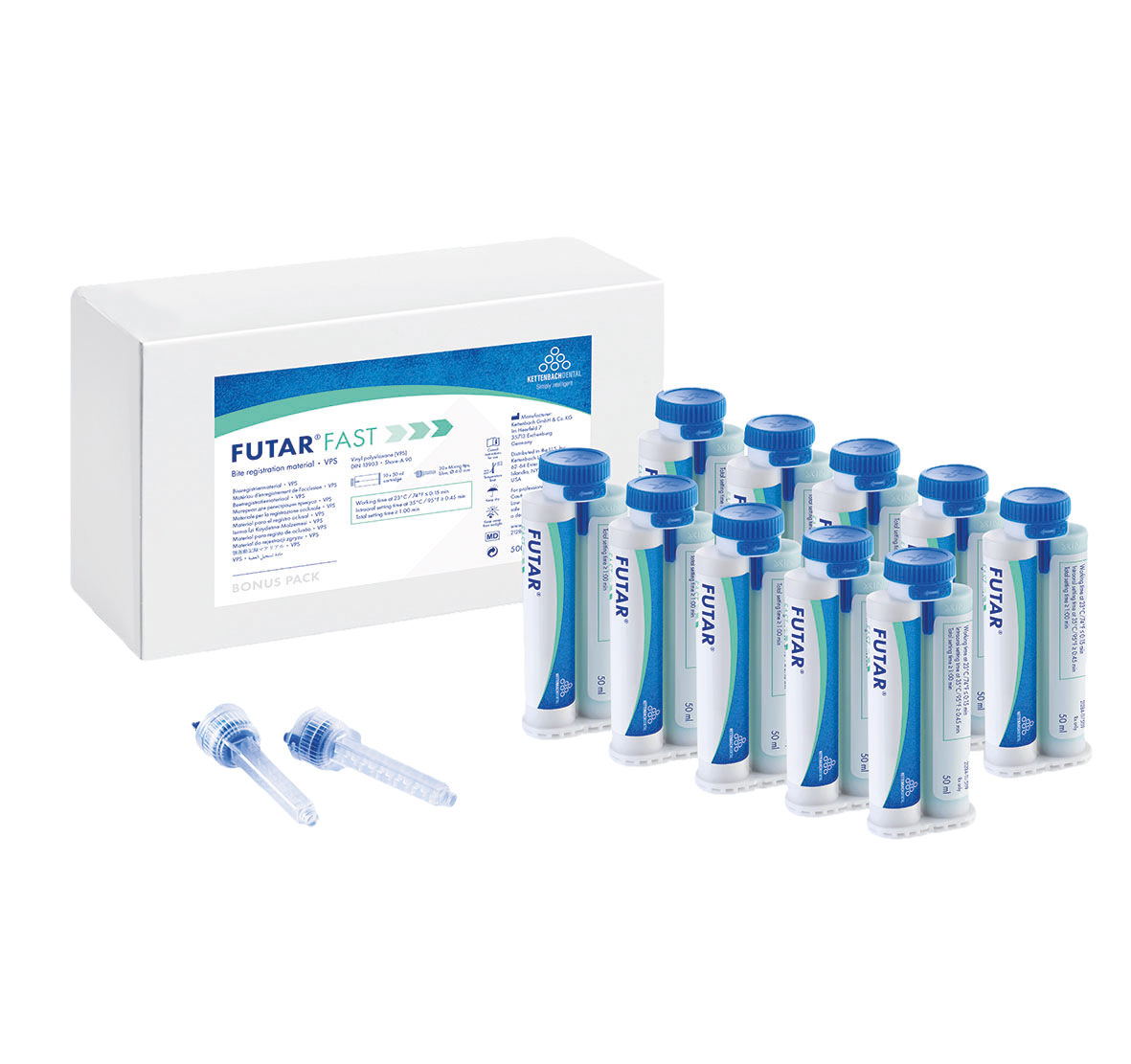 Injectable elastomeric bite registration material based on A-silicone for creating precise impressions of the occlusal situation. Suitable for applications that require a hard silicone. High final hardness (Shore A 90) and flexible processing. Precise results due to outstanding flow properties. Easy to handle, and easy to trim with a scalpel. Highly thixotropic: does not flow away into the interdental spaces but remains stable on the tooth. Extra-fast working time (15 seconds) and very short intraoral setting time (45 seconds), creating the bite registration in just one minute. Bonus Pack includes Cartridge 50ml x 10 and Mixing Tips Blue x 30.