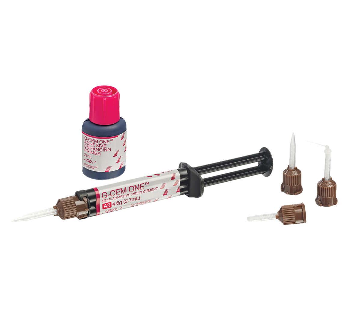 Universal self-adhesive resin cement with dual-cure ability, designed to provide strong and durable bonding of indirect restorations. Boasts exceptional bonding strength, handling properties, and long-term stability, making it a reliable choice for a wide range of clinical applications. Highly versatile in bonding to various substrates without the need for additional primers or adhesives. However, when more adhesion is needed, it can be used with either G-CEM ONE Adhesive Enhancing Primer or G-Premio BOND. Features a self-curing mechanism, which enables it to achieve high bond strengths even in the absence of light-curing. This feature makes it ideal for use in areas that are difficult to access with curing lights, such as the proximal surfaces of posterior teeth. Starter Kit includes Syringe (A2) 4.6g, Adhesive Enhancing Primer 2ml, Automix Tips Regular x 8 and Automix Endo Tips x 2.
