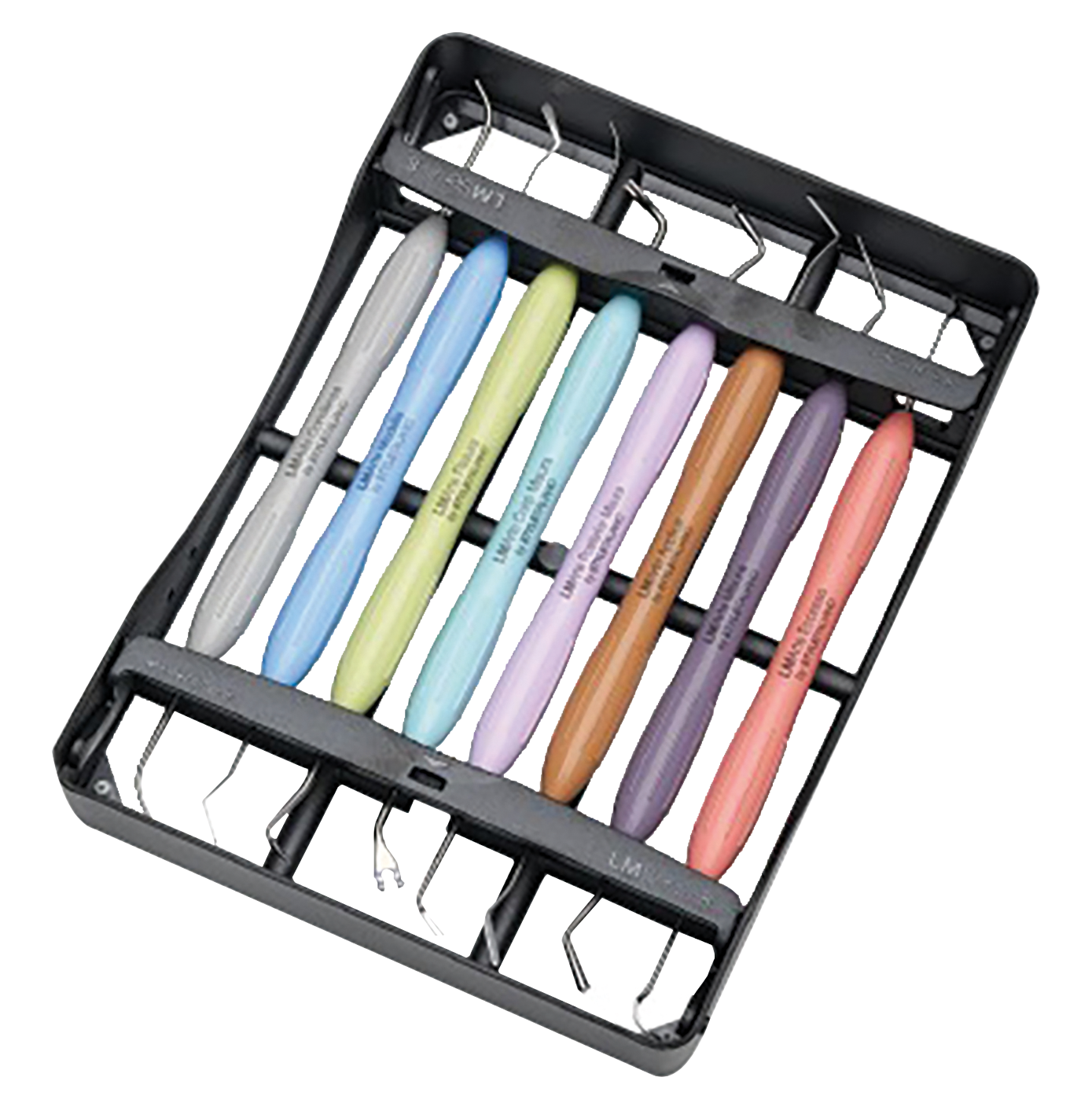 Set of innovative instruments for aesthetic restorations, designed especially for composite layering. Each instrument is colour coded and named by its main function to enable easy, efficient and quick restorative treatments. Full instrument kits supplied in LM-Servo 8 cassette. Kit includes Eccesso, Misura, Applica, Posterior Misura, Cusp Misura, Fissura, Modella, and Condensa.