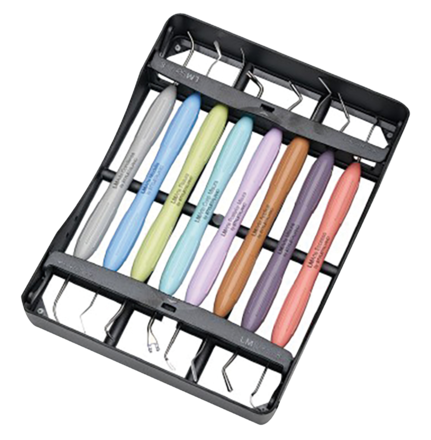 Set of innovative instruments for aesthetic restorations, designed especially for composite layering. Each instrument is colour coded and named by its main function to enable easy, efficient and quick restorative treatments. Full instrument kits supplied in LM-Servo 8 cassette. Kit includes Eccesso, Misura, Applica, Posterior Misura, Cusp Misura, Fissura, Modella, and Condensa.