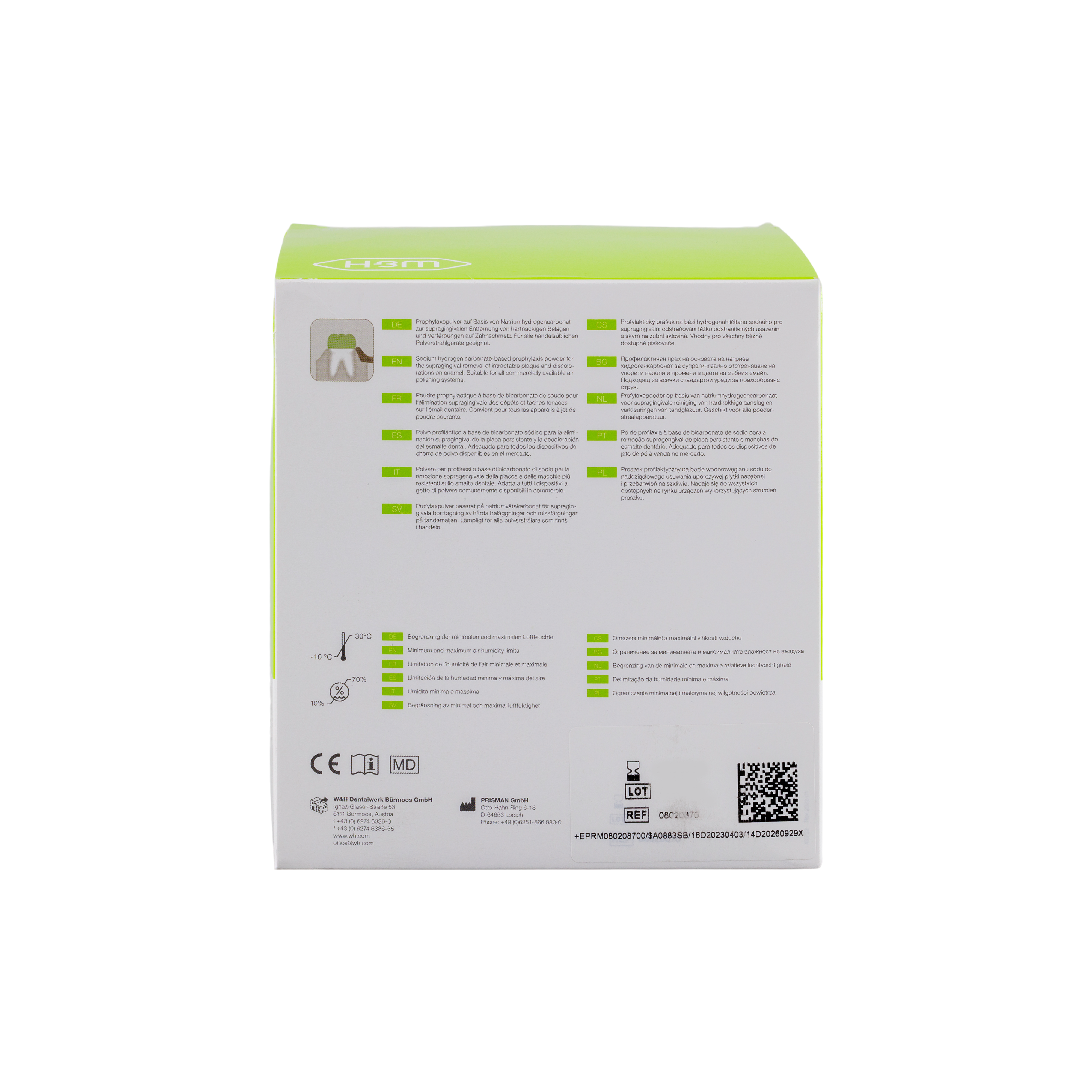Prophy polishing powder that forms part of the proxeo AURA range. Powder, handpiece and spray heads work together to allow efficient and atraumatic supragingival and subgingival cleaning.