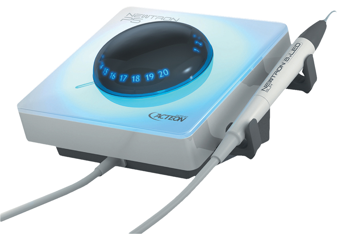 Compact and stylish ultrasonic generator combining 4 treatment modes for efficient clinics and innovations. Sleek, ergonomic design with removable control dial and handpiece holder for greater aseptic control. Equipped with B.LED technology for the detection and treatment of dental plaque. Reveals plaque using fluorescence from the blue light of the NEWTRON SLIM B.LED handpiece. Kit: Newtron P5 B.LED, Newtron Slim B.LED Handpiece, Blue Ring, White Ring, Tip No 1, Tip No 10x, Tip No 10z and Autoclavable Wrench.