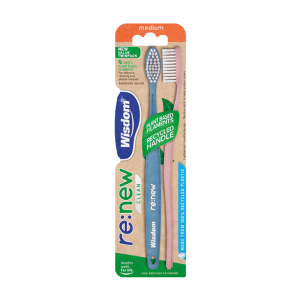 Toothbrush made from 100% recycled plastic. Lightweight design minimises material usage and impact of the environment. Filaments are 100% plant based and derived from sustainably sourced caster oil plants, to provide an effective, gentle clean. Flexible neck to help protect gums. End-rounded filaments for effective plaque removal. Packaging made from 100% recycled cardboard.
