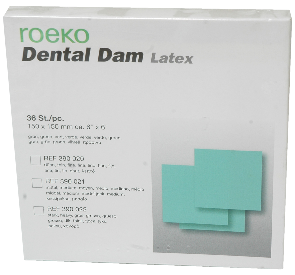 Latex dental dam. Easy to use, ensures optimum moisture control. High elasticity material contracts closely around the tooth for effective isolation. 150 x 150mm.