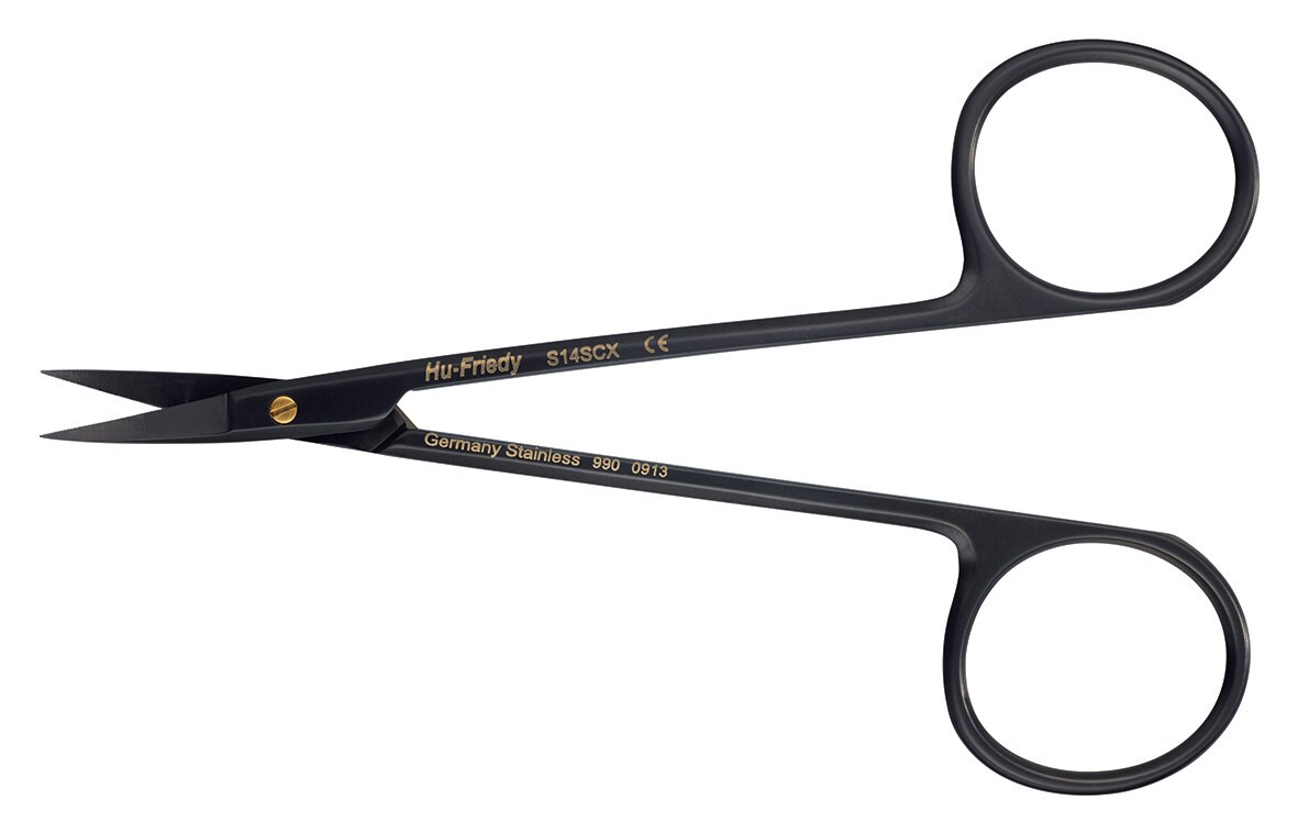 Black scissors used for trimming tissue or cutting sutures. Features a non-reflective surface, improved contrast between tissue/scissor. 11.5cm. Performance engineered coating for a smoother surface. Gold screw for easy identification of Super-Cut design. Distinct black finish for enriched contrast and visual acuity at the surgical site. Super-Cut design featuring a razor sharp blade and serrated edge for reduced tissue slippage.