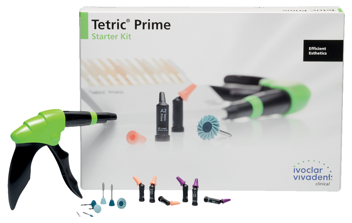 Light-curing, radiopaque composite (300%Al) for direct anterior and posterior restorations. Cures with light in the wavelength range of 400500 nm. Includes: Tetric Prime Refill 0.25g x 10 (A2 and T), Cavifil Injector Refill Redesign, OptraGloss Test Pack 2, and Tetric Prime Shade Guide.